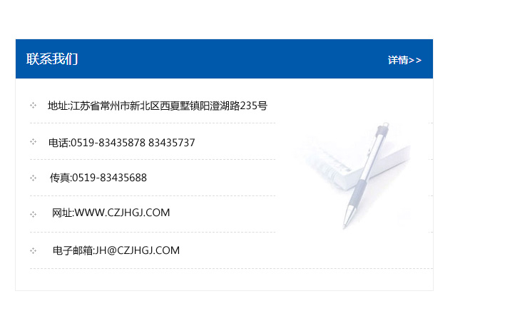 地址:常州市新北區(qū)友邦商務(wù)大廈1幢16、17層  電話:0519-85101652  傳真:0519-85112595  郵編:213022  網(wǎng)址:www.cz-jiayue_cn.duomixinxi.com  郵箱:xiajifengaa@163.com